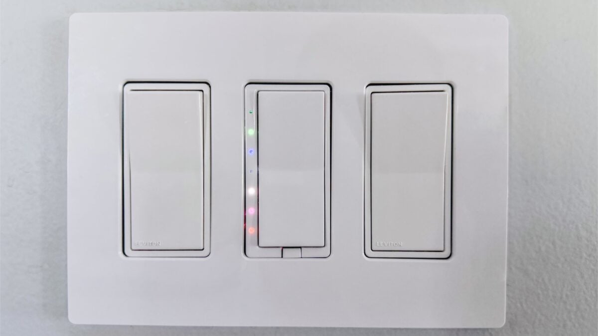 [A] listener pointed me to these now-discontinued HomeSeer switches. At a glance, this a standard Decora-style dimmer that can be controlled via ZWave. However, upon closer inspection, there are seven LEDs on the left-hand side. Even more interestingly, you can put the switch in “status mode”, which means each of the LEDs can be individually controlled.