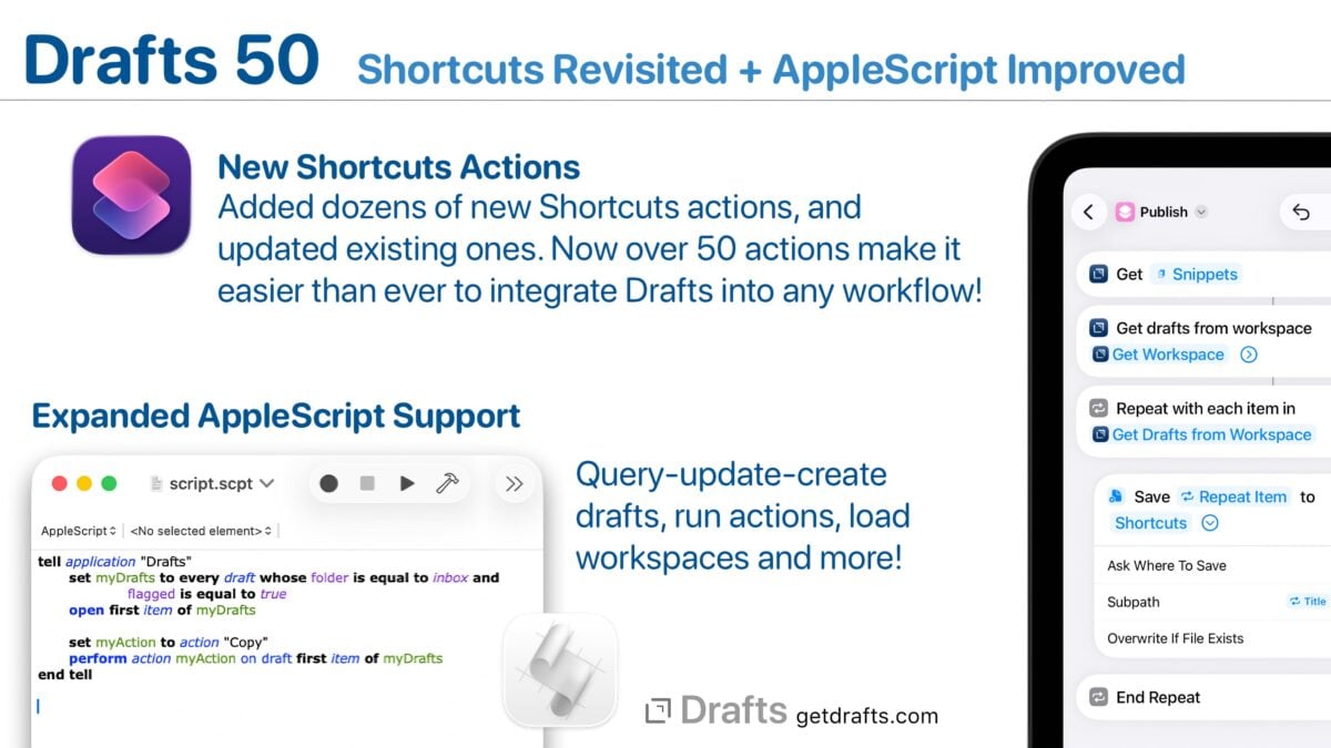 Drafts 50 released! Shortcuts Revisited, AppleScript Improved (Client Work)