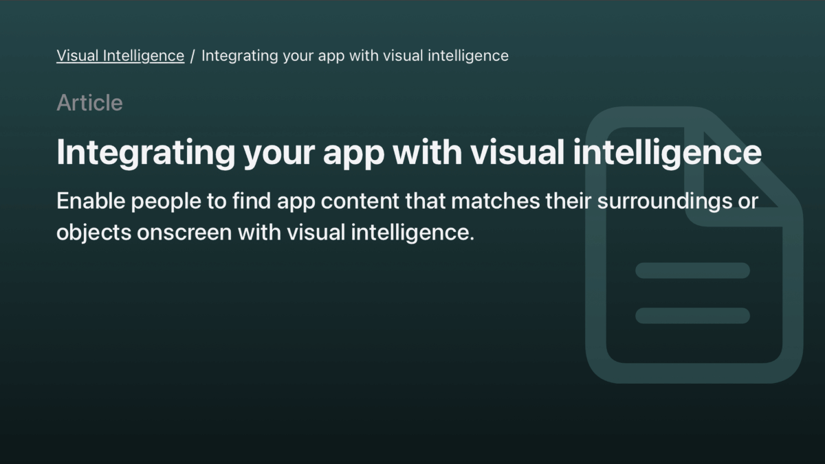 Browse the full documentation from the Apple Developer site and learn how to use Visual Intelligence for iPhone.