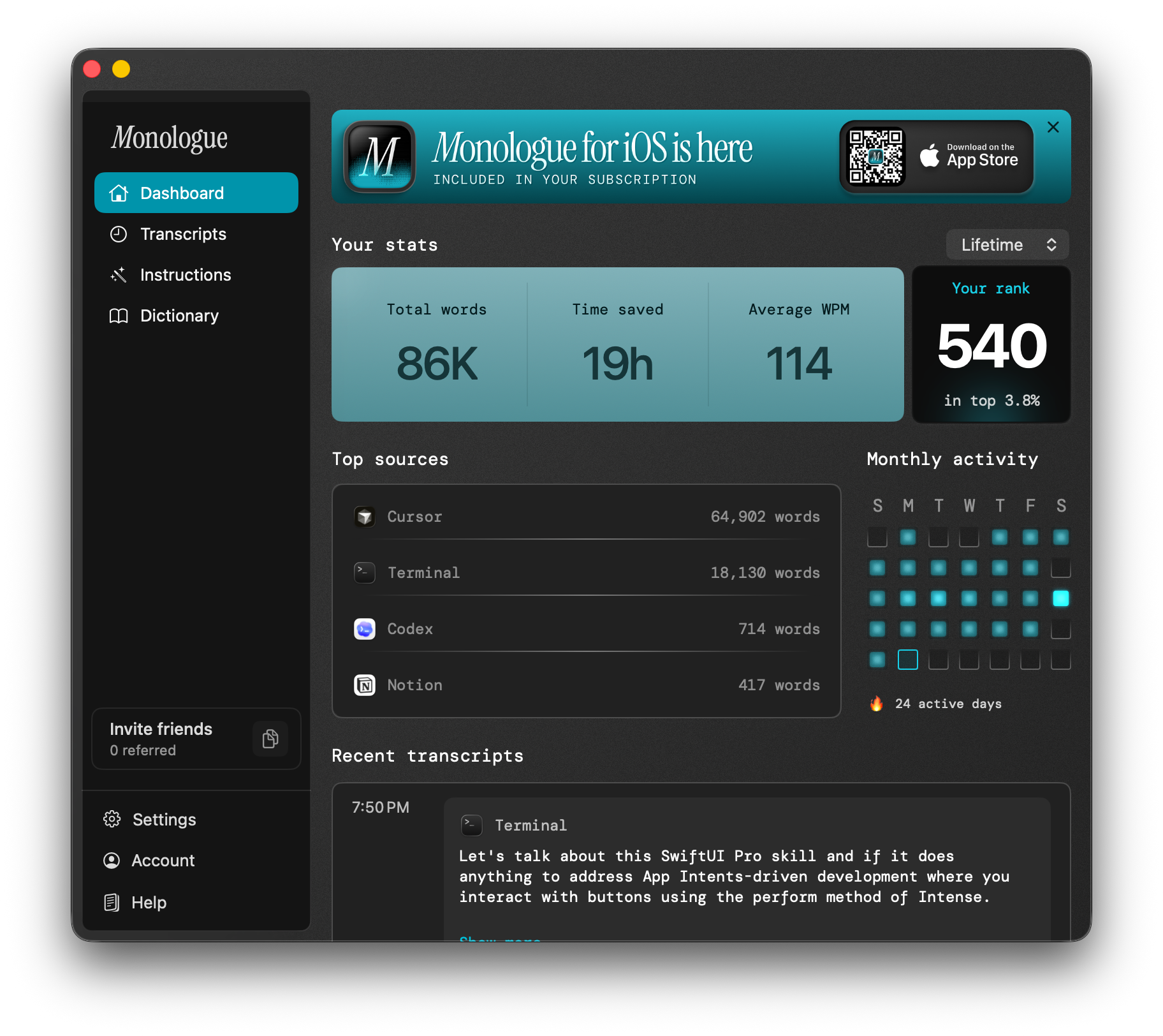 I’ve written a short novel’s worth of words using Monologue, a smart dictation app for Mac and iOS that I’ve been using almost every day since I got it in February. Logging over 86 thousand words for a total of 19 hours saved, I’m currently ranked 540 in Monologue’s lifetime leaderboard. That means I’m in the top 3.8% of users – I’m using the hell out of this app.