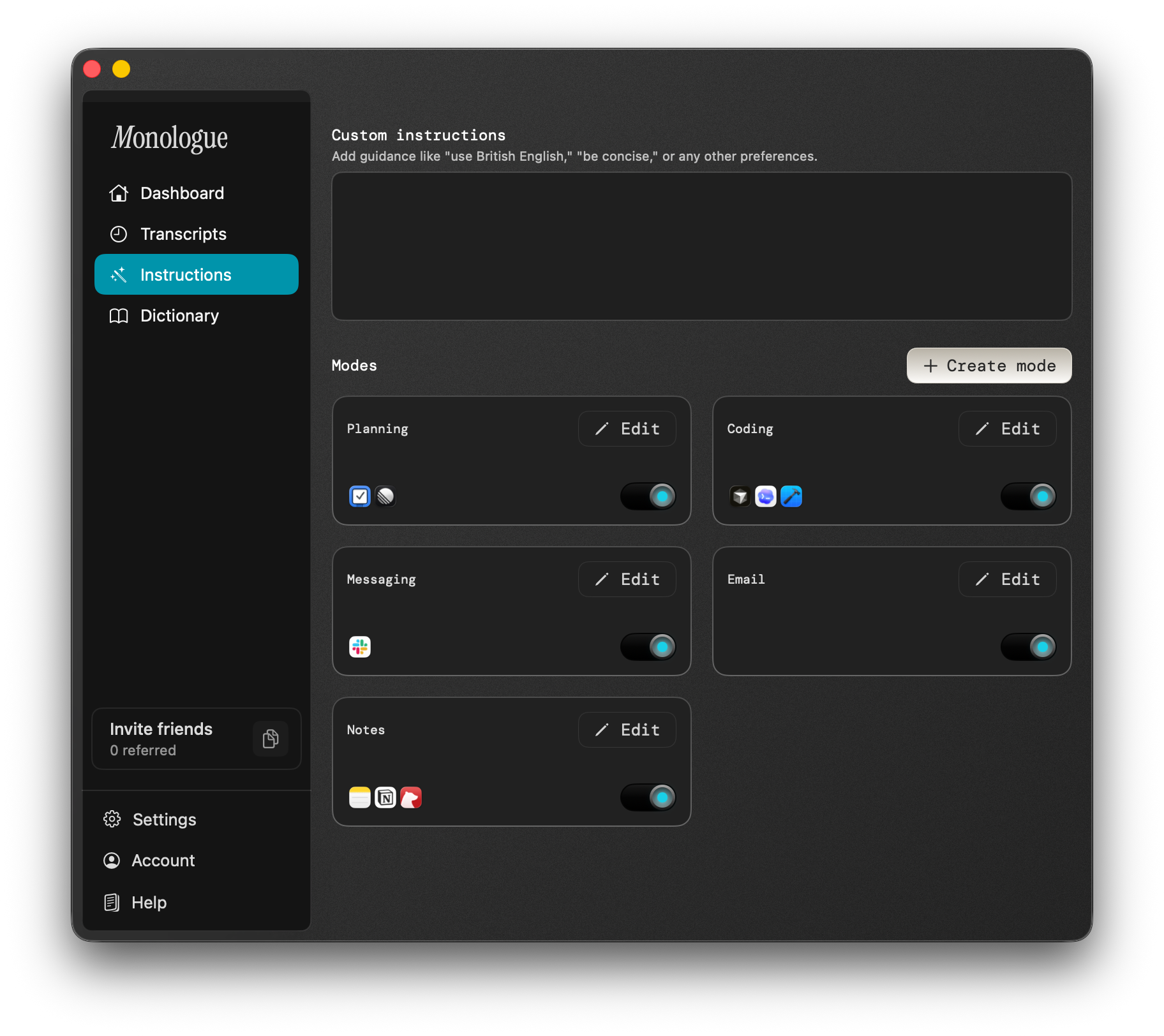 I’m mostly using Monologue to dictate to my AI agents, which I’m finding very helpful as I can free-associate with an idea as I, ahem, monologue at the computer, and then rely on the AI to understand what I’m saying and turn it into helpful tasks from my jumbled thoughts. In particular, I will use Monologue to dictate into Cursor, then switch to Plan Mode, and have it turn my blob of text into a real action plan – which it then immediately executes.