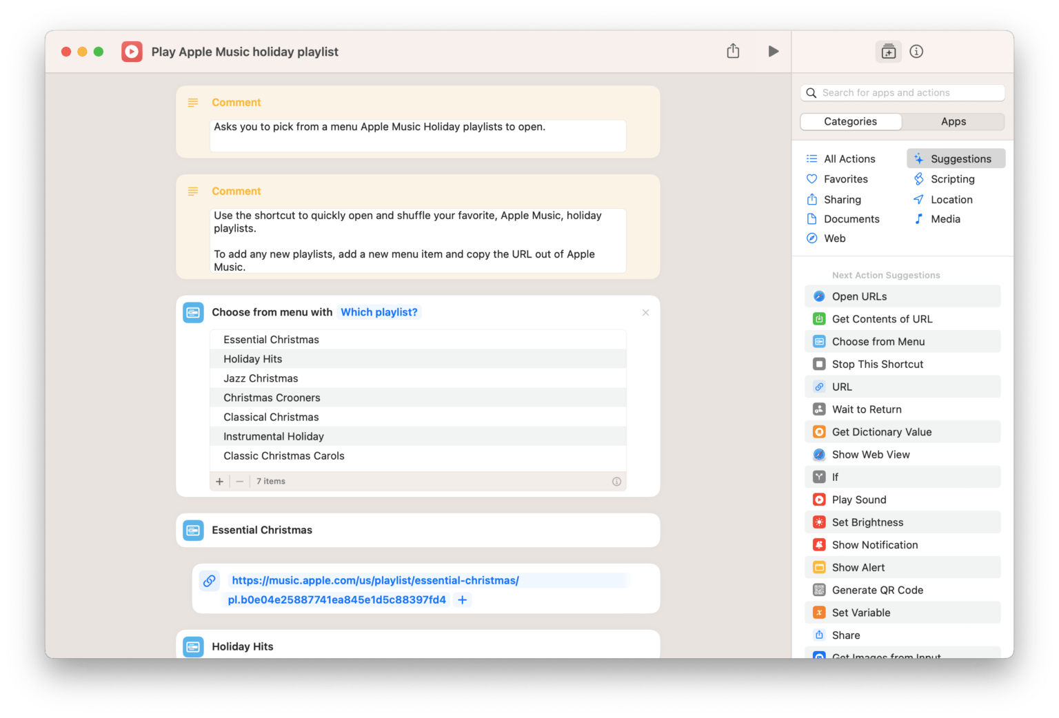 Asks you to pick from a menu Apple Music Holiday playlists to open.