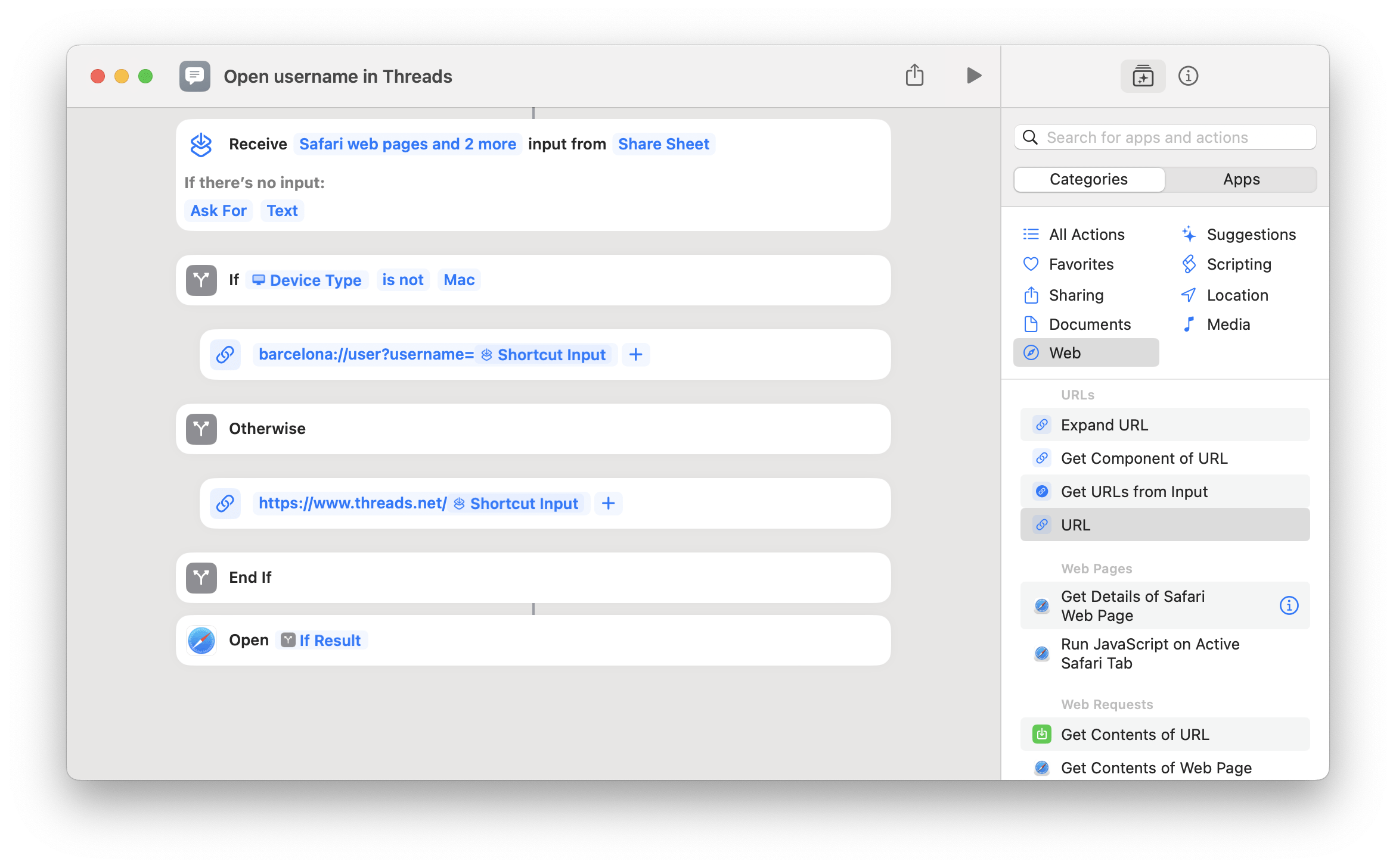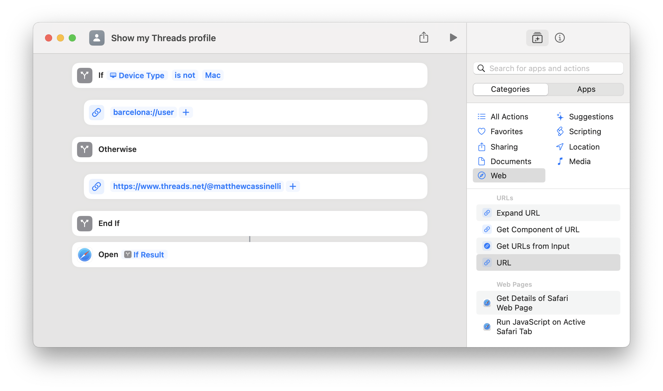 My “Open username in Threads” shortcut will prompt you to enter in a username, then fills out a URL like barcelona://user?username=MatthewCassinelli – then, the Open URLs action activates the deep link and redirects you into the profile inside the Threads app, so you can follow the person.